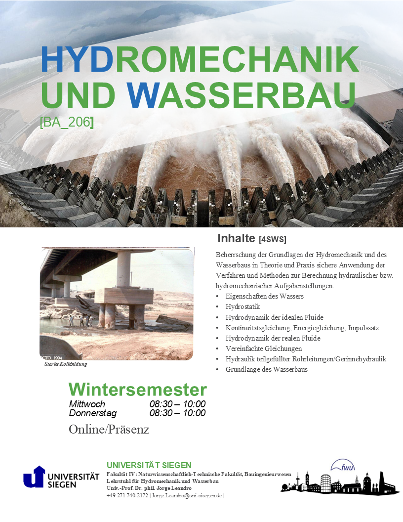Beherrschung der Grundlagen der Hydromechanik und des Wasserbaus in Theorie und Praxis sichere Anwendung der Verfahren und Methoden zur Berechnung hydraulischer bzw. hydromechanischer Aufgabenstellungen.